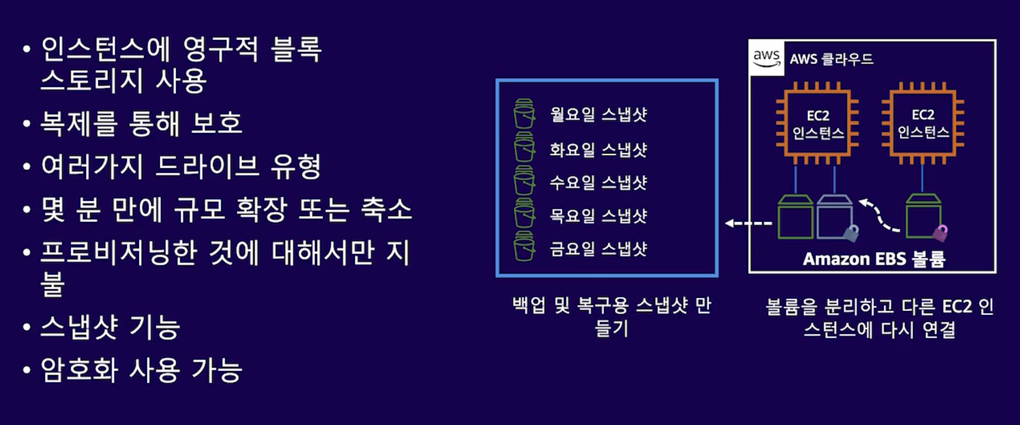 Amazon EBS 볼륨은 사용이 쉽고 확장 가능한 고성능 블록 스토리지 서비스로서 Amazon EC2용으로 설계되었다. 이 블록은 EC2 인스턴스에 탑재되므로 데이터가 저장된 위치와 인스턴스에 사용되는 위치 사이에 매우 짧은 지연 시간을 제공할 수 있다. Amazon EC2 인스턴스를 사용해 데이터베이스를 실행하는 데에도 사용할 수 있다. Amazon EBS는 트랜잭션 워크로드를 위한 SSD 지원 스토리지와 처리량 워크로드를 위한 HDD 지원 스토리지 모두를 지원한다. 프로비저닝 된 IOPS SSD, 범용 SSD, 처리량 최적화 HDD 및 콜드 HDD 등으로 세분화된 볼륨 유형을 제공한다. 이 볼륨 유형은 성능 특성과 가격이 다르므로 애플리케이션의 필요에 맞게 스토리지 성능과 비용을 조정할 수 있다. 스냅샷을 만들어 Amazon S3에 Amazon EBS 볼륨의 데이터를 백업할 수 있다. 스냅샷은 증분식 백업이며 마지막 스냅샷 이후 변경된 디바이스의 블록만이 저장된다. 그러면 스냅샷을 만드는 데 필요한 시간이 최소화되며 데이터를 복제하지 않으므로 스토리지 비용이 절약된다. 스냅샷은 EC2 인스턴스의 새 볼륨을 생성하는데 사용할 수 있다.