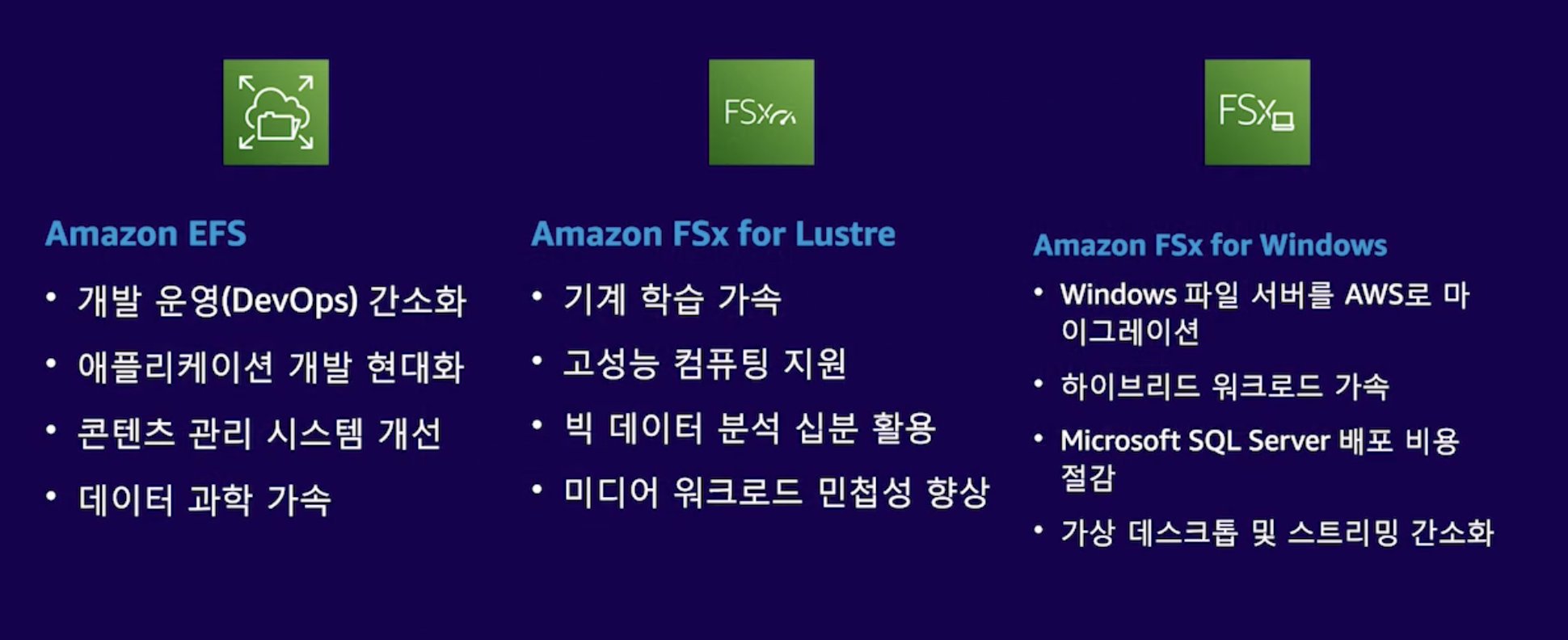 이 경우 사용할 수 있는 서비스인 Amazon EFS와 Amazon FSx가 있다.