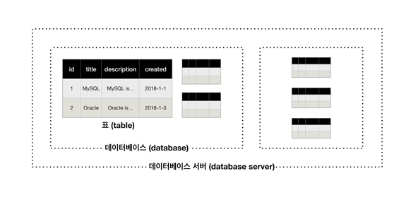 - Database (데이터베이스) : 테이블을 모아 놓은 곳